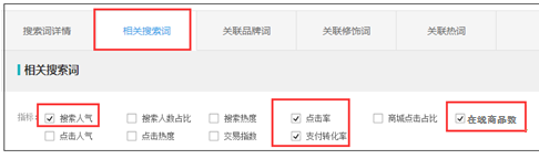 然后在下面的数据筛选框中,留下四组数据:搜索人气、点击率、在线商品数、支付转化率。