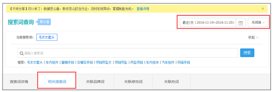 核心权重词确定了,下面的关键就是去确定长尾词。还是利用生意参谋,把你确定的核心权重词在搜索框里面输入,然后还是选择最近7天的数据,选择无线端,然后点击一下“相关搜索词”,我们就假设核心权重词选择了“毛衣女套头”: