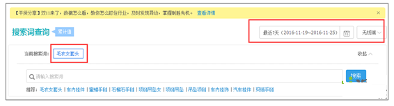 打开生意参谋——市场行情——搜索词查询——选择最近7天的数据,无线端(因为现在主要的流量都来源于无线端),输入你要查询的关键词。