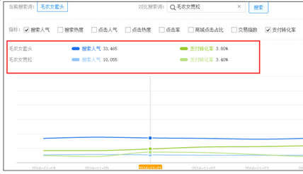 这里比较开心的是:你可以同时对比两个词,这样你就可以清晰的看出来他们之间的数据好坏和区别。至少我们看这两个关键词,“搜索人气”和“支付转化率”这两个数据来看: