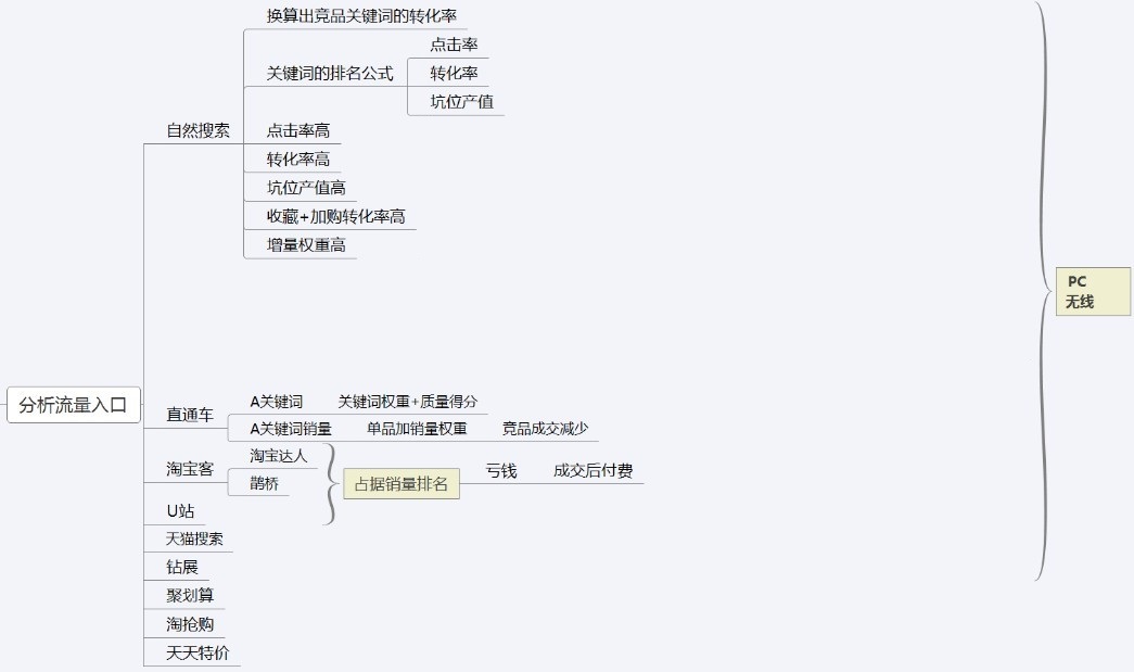 前面我们也说了,我们是抢夺市场里原有消费者,而不是去开拓新的消费者,怎么去分析他的流量来源呢?自然就是从免费和付费两个方面着手,这里就不细说了,大家可以看一下下面的思维导图来了解一下: