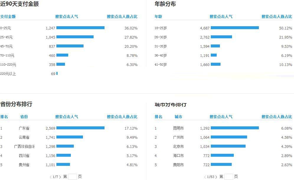 2:刚才说到价格,现在要说的是关键词的市场竞争力,每个关键词都是一个市场对应的3到5个人群稍微解释一点就是手机端每个关键词下有三个价格区间3个价格人群,PC端有五个价格区间五个对应的人群!